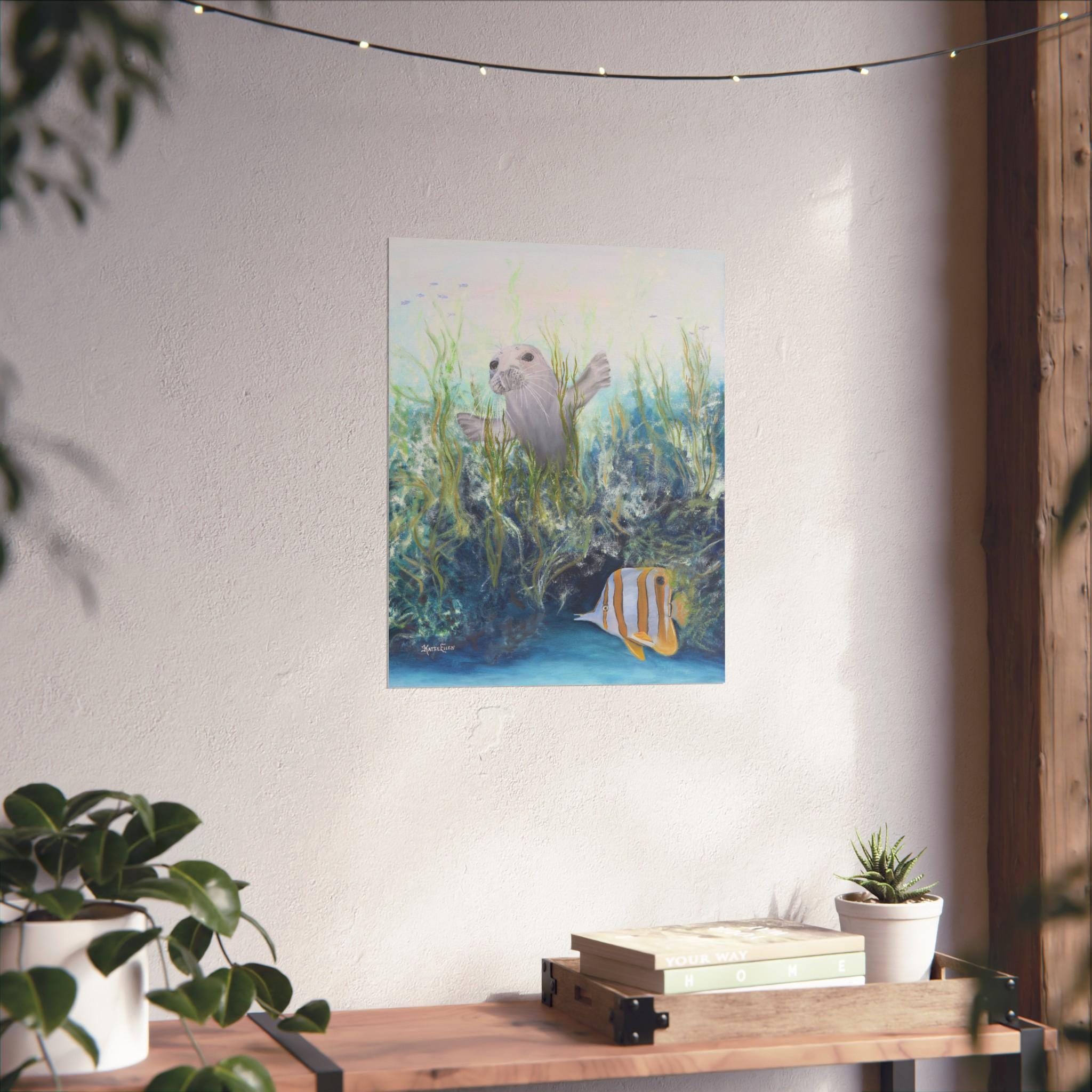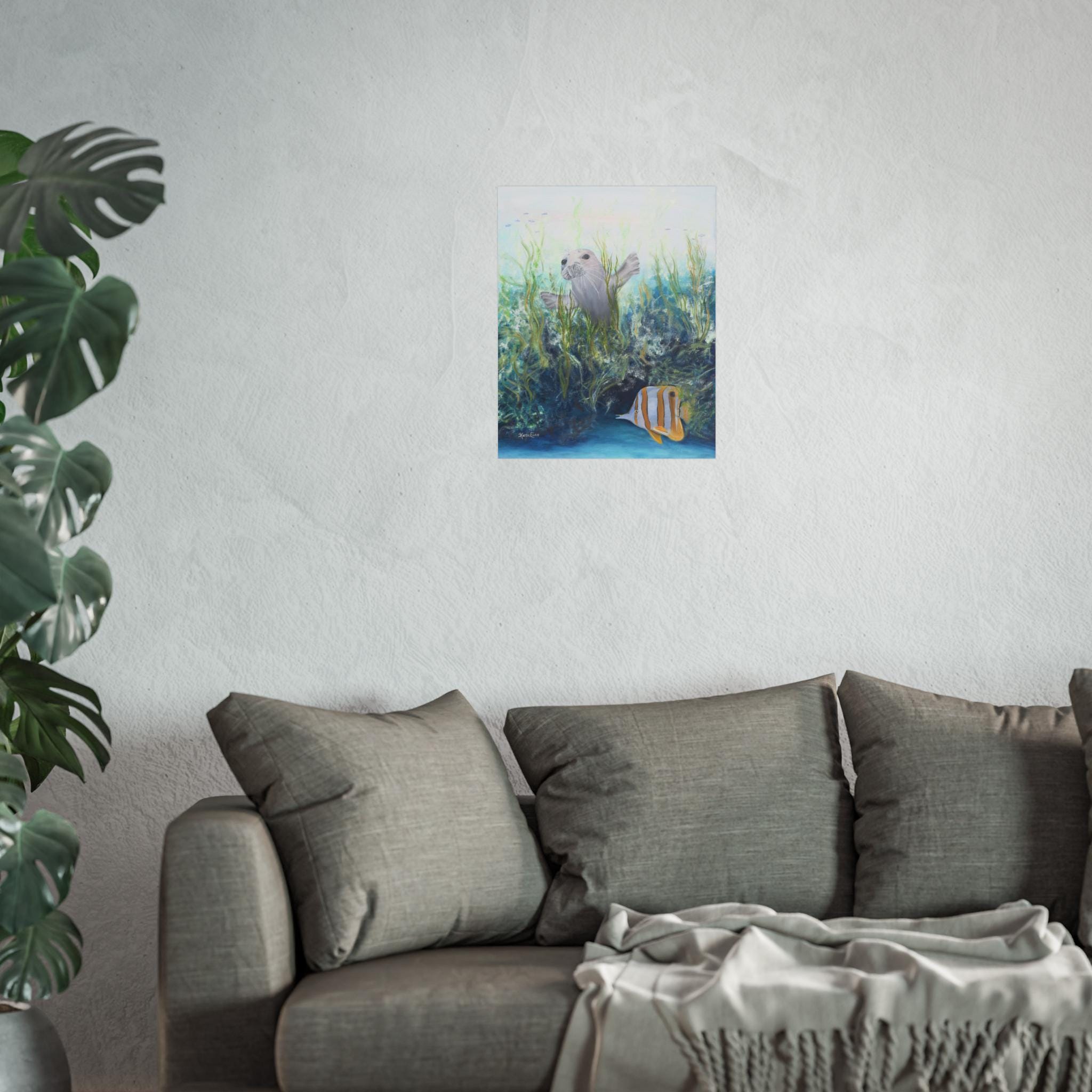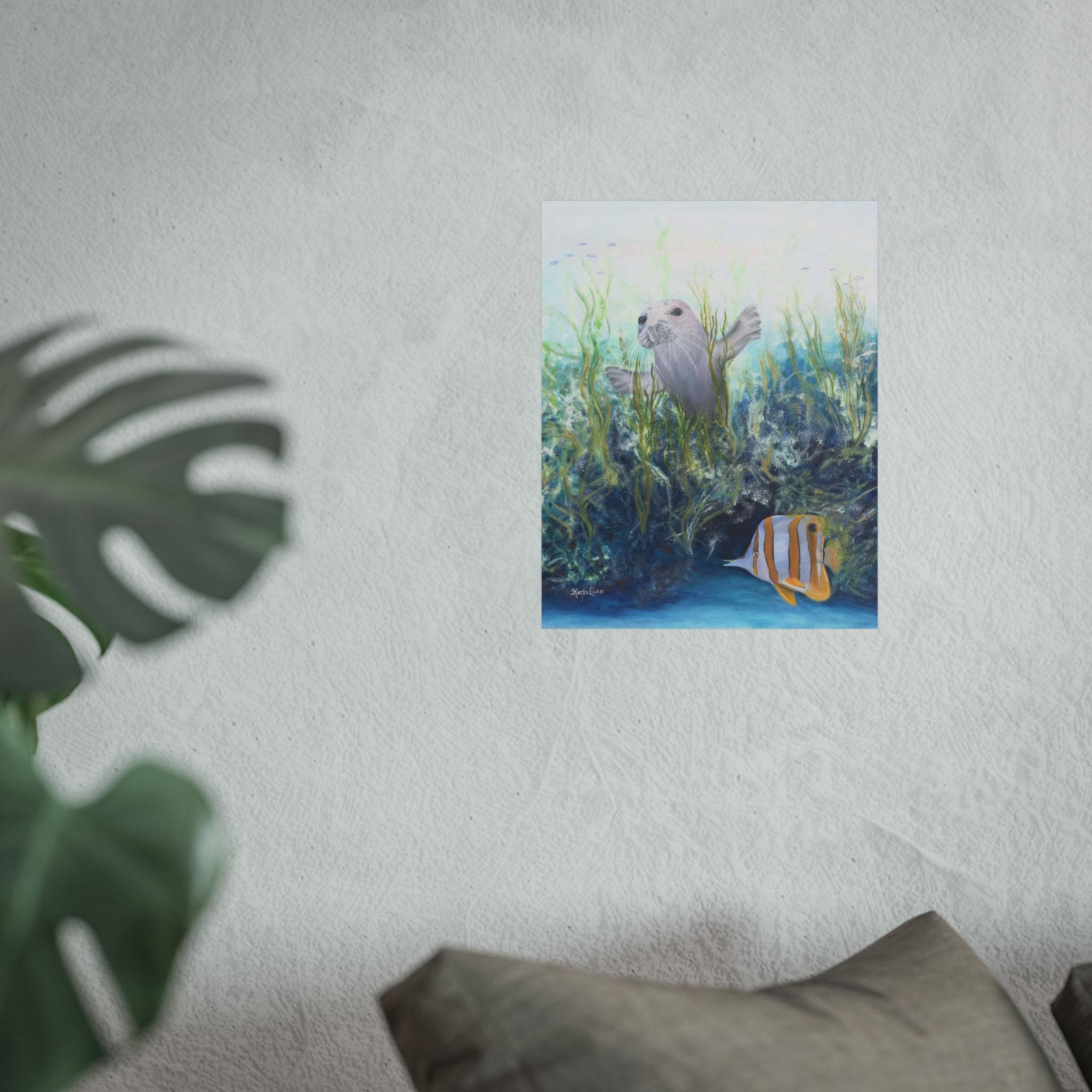 Soft, underwater light settles across this fine art poster, where a curious seal pops up through kelp and a striped tropical fish glides below. The scene carries gentle blues and sea-greens, painted with delicate brushstrokes that emphasize movement and serenity. Hung in a quiet corner or above a reading chair, this print brings a coastal calm—like breathing in cool ocean air and listening to muffled waves. It complements relaxed, nature-focused interiors and adds a thoughtful, meditative touch to a bedroom, home office, or living room. The matte surface keeps reflections low so the artwork reads clearly from different angles.